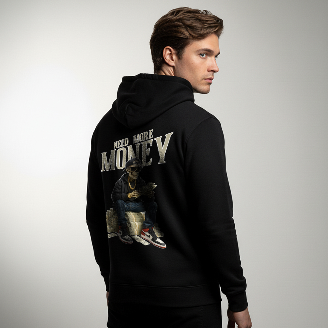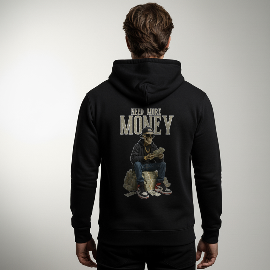 Design: High-quality back print featuring the “NEED MORE MONEY” slogan and a detailed Skeleton on Cash Graphic. Targets searches for Money Themed Clothing, Hustle Apparel, and Street Art Graphics.